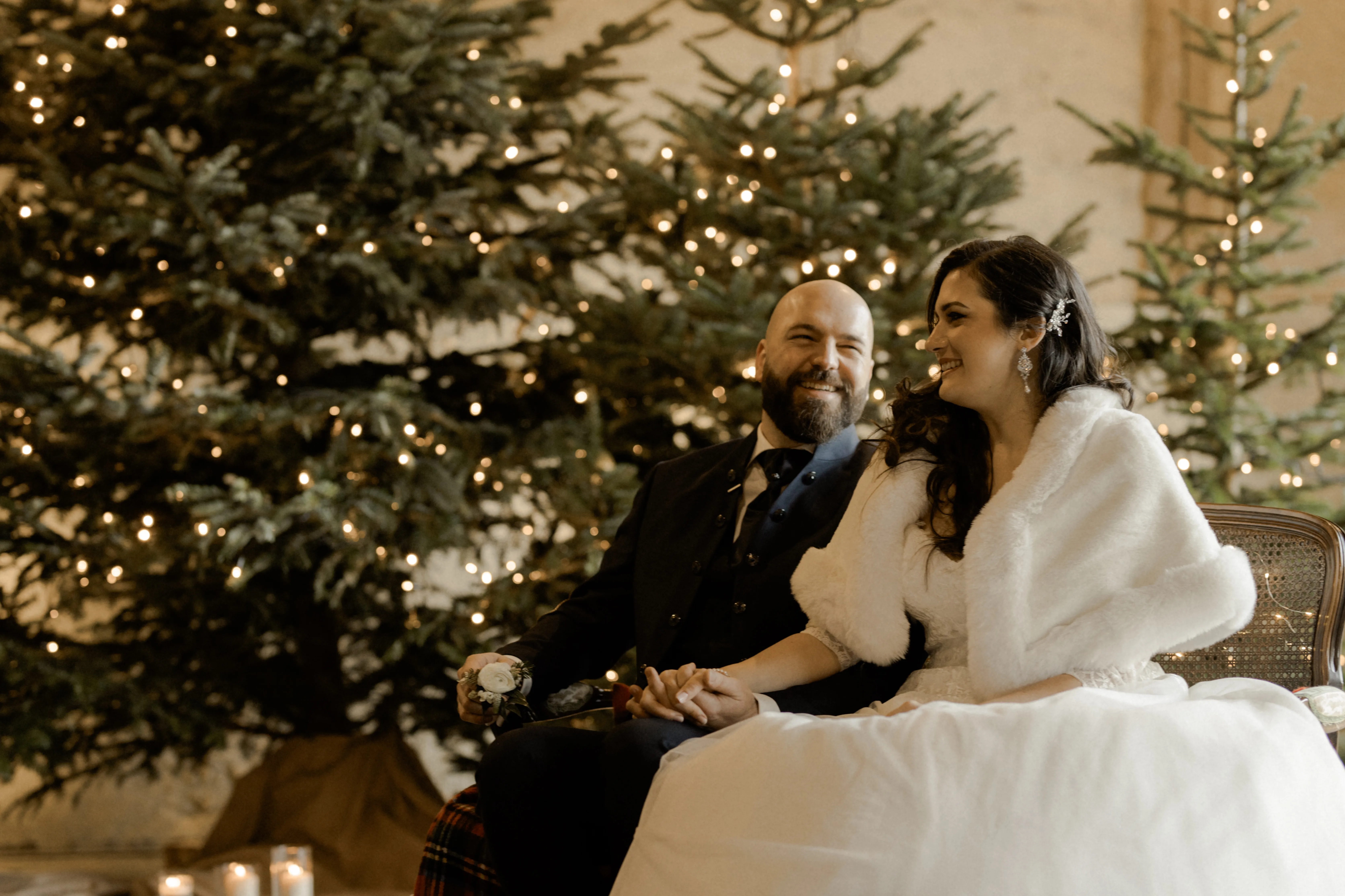 - Mariage de Noël : sapins, bougies, guirlandes lumineuses et touches dorées.